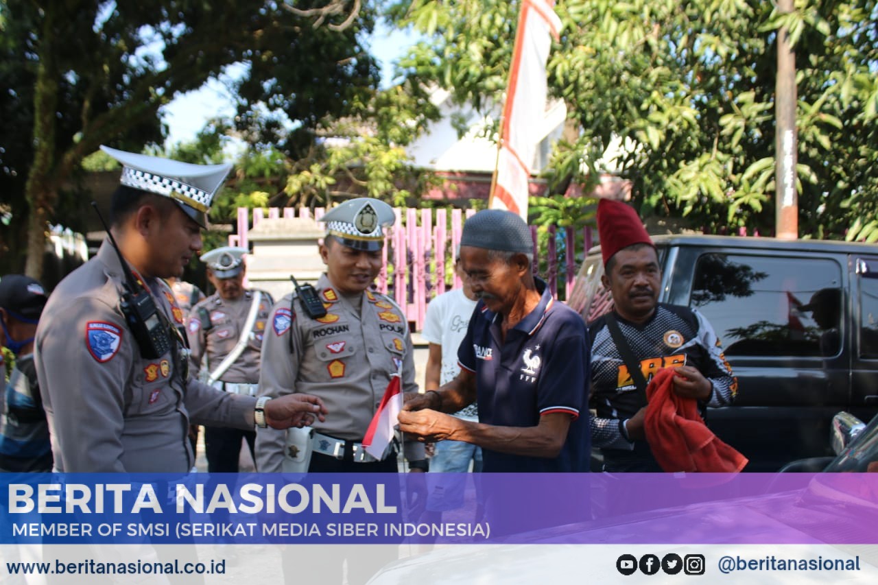Gugah semangat nasionalisme, Satuan Lalu Lintas Polres Bondowoso membagikan bendera Merah Putih kepada pengemudi angkutan hewan dijalan Pasar Hewan Kademangan Bondowoso.