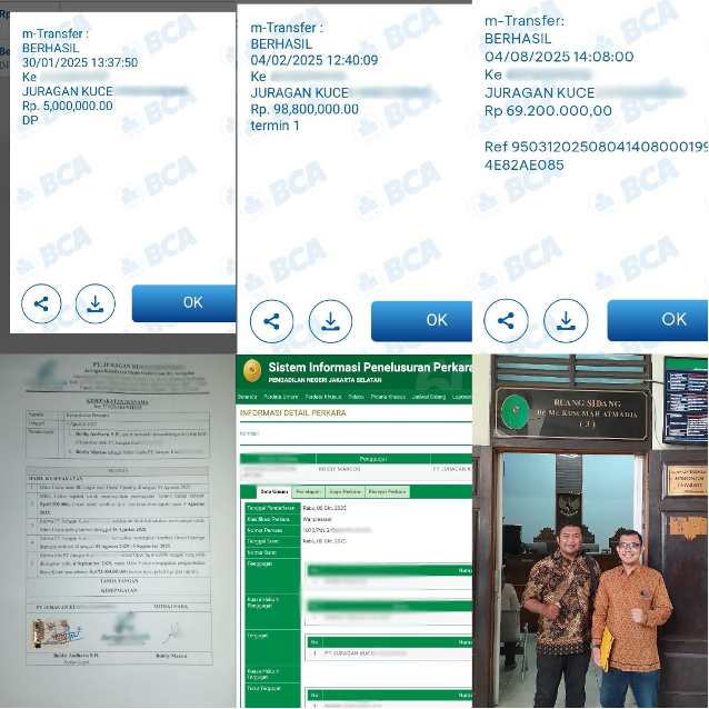 Pada 30 Januari 2025, Robby Marcos (korban) membayar uang muka sebesar Rp 5.000.000,- (lima juta rupiah), kemudian melanjutkan pembayaran tahap pertama Rp 98.800.000,- (sembilan puluh delapan juta delapan ratus ribu rupiah) setelah mengunjungi kantor Juragan Kuce*. Pihak perusahaan berjanji akan melakukan grand opening outlet pada 1 Juli 2025.