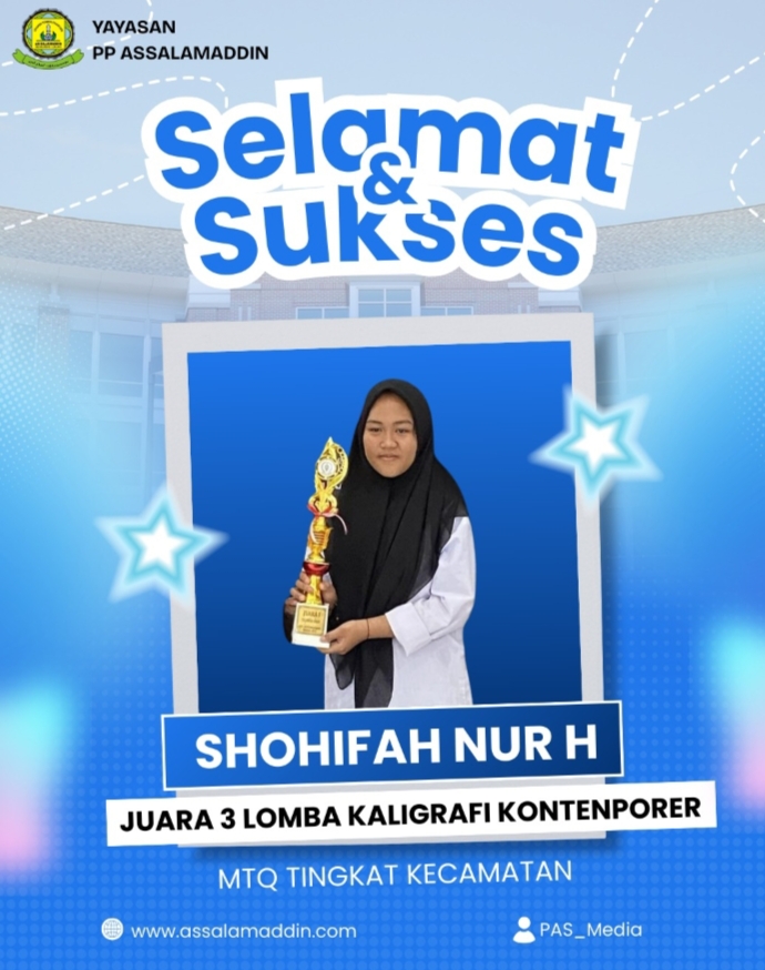 Alhamdulillah, masih menurut Gus Althof, santri kami meraih juara 3, atas nama Shohifah Nur Hasanah dan Hermawan. “Saya berterima kasih kepada ustad yang membina mereka yaitu Abdul Mannan, S.S dan Rahmad Hidayat, S.E yang telah membimbing mereka untuk melakukan persiapan-persiapan sebelum lomba kaligrafi dilaksanakan,” ungkapnya.