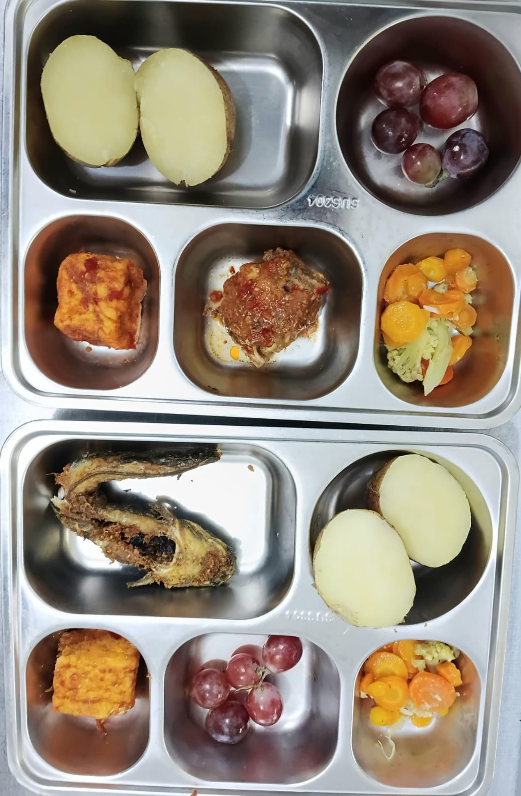 Pada penyajian hari ini, pengganti nasi dipilih kentang rebus yang dinilai aman dan cukup memenuhi kebutuhan karbohidrat bagi siswa yang tidak dapat mengonsumsi nasi. Sementara itu, siswa yang alergi daging ayam diberikan ikan lele sebagai protein alternatif yang memiliki kandungan nutrisi setara dan mudah dicerna.