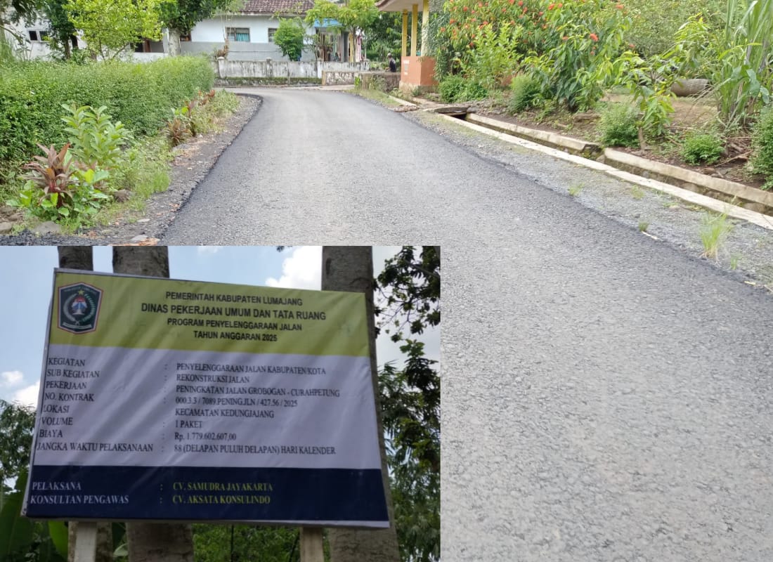Rekonstruksi jalan penghubung Desa Grobogan – Curahpetung ini menelan anggaran sebesar Rp 1.779.602.607,00 dengan nomor kontrak 000.3.3/7089.PENINGJLN/427.56/2025 pelaksana oleh CV. Samudra Jayakarta dan konsultan pengawas dari CV. Aksata Konsulindo.